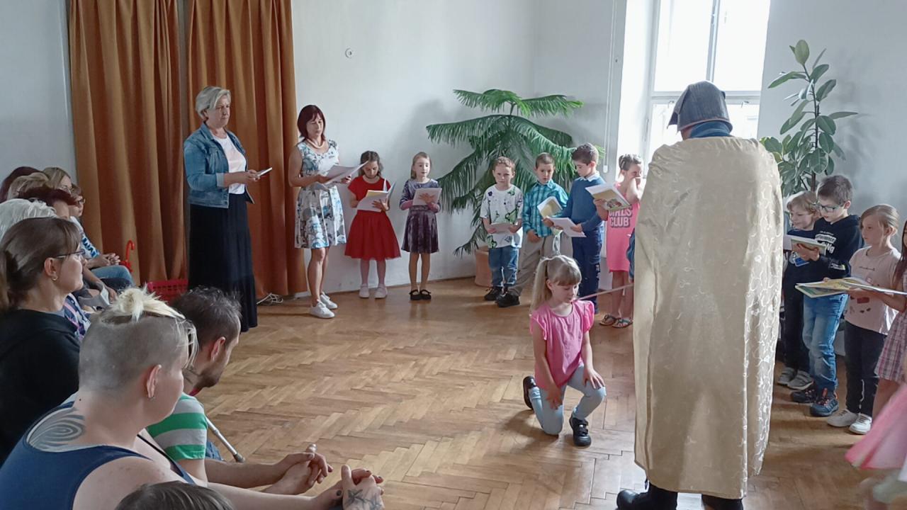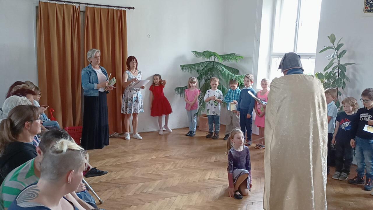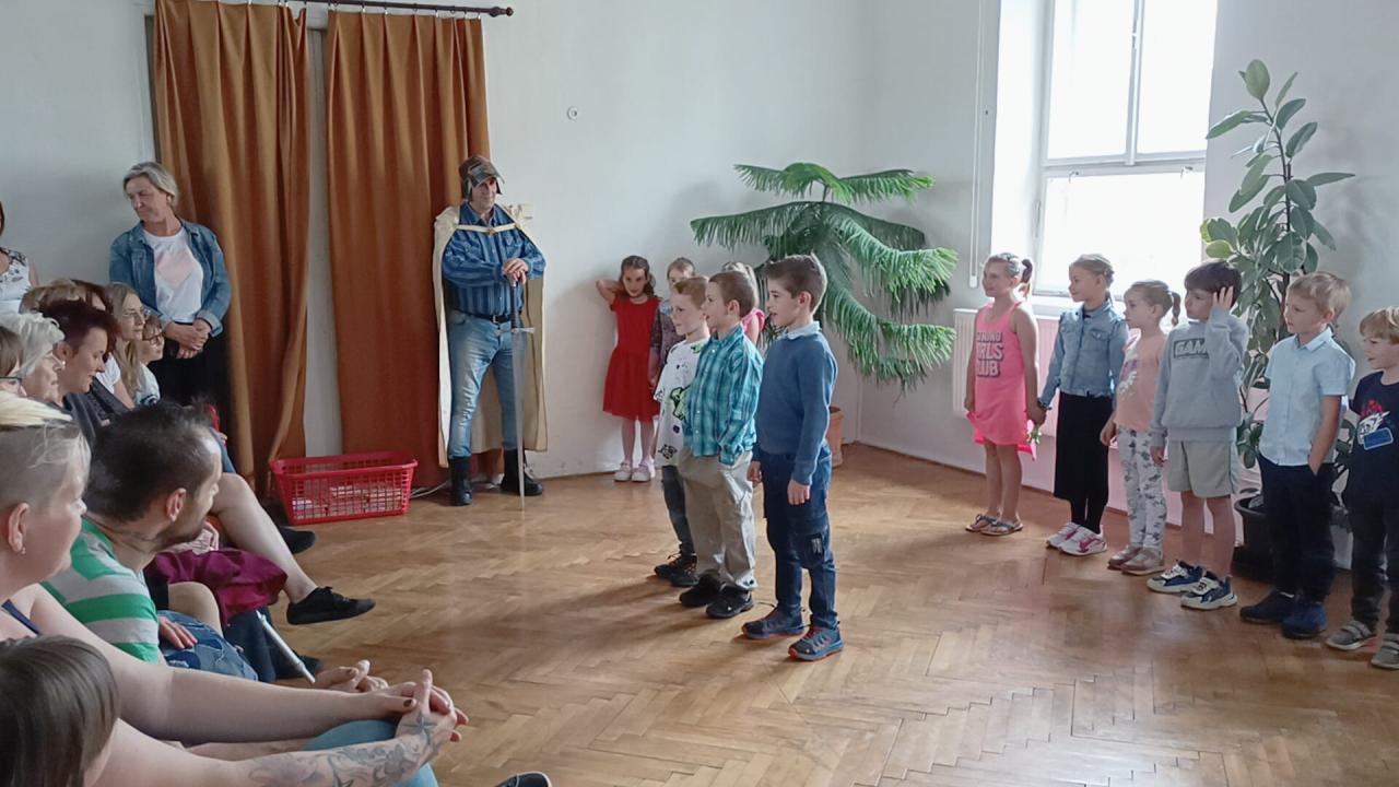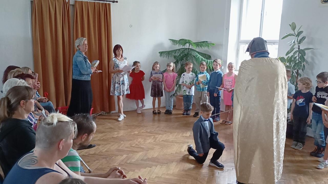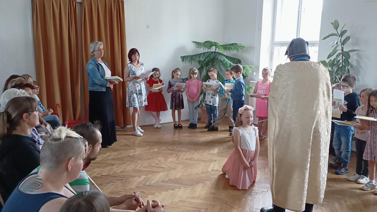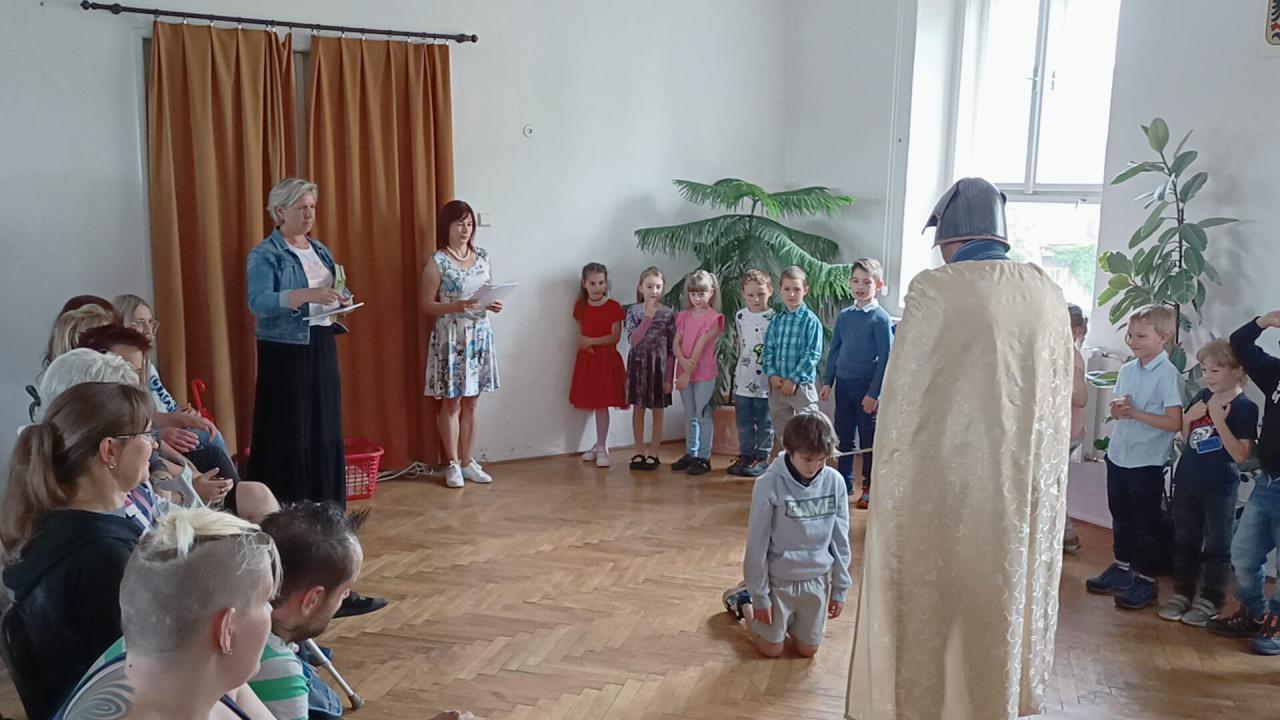 Do sálu zavítal také rytíř-ochránce knih, kterému děti přednesly krátké říkanky. Po složení čtenářského slibu pasoval na čtenáře všechny prvňáčky.