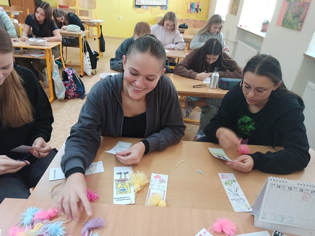 Většina záložek byla papírových, malovaných či kreslených, od tradičních proužků čtvrtky přes záložky ve tvaru zvířátek k papírové skládačce slona, která se umísťuje jako záložka na růžek stránky. Některé byly ozdobené barevnými vlněnými bambulkami, jiné byly zatavené v průhledném plastovém obalu. Zajímavý byl nápad s citáty známých osobností o soužití člověka se zvířetem. Tyto citáty žáci napsali na druhou stranu záložky. Naše „výtvory“ jsme odeslali partnerské škole na Slovensko, tentokrát nám vybrali ZŠ a MŠ Poproč. Na oplátku jsme dostali záložky jejich.