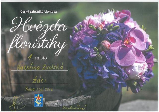 20. 5. 2016 se Káťa Zvolská z 9.tř. zúčastnila Zemského kola floristické soutěže, které se konalo v Praze. Soutěžilo se ve třech kategoriích: v kategorii žáků základních škol, v kategorii žáků středních škol a v kategorii seniorů. Káťa si vedla velice dobře, vytvořila krásnou vypichovanou misku i vázanou kytici a umístila se na 1. místě v kategorii žáků základních škol, které jí zajistilo postup do finálového republikového kola. Finále soutěže proběhne 15. 7. 2016 na výstavě „Květy 2016″v Lysé nad Labem. Iva Trnková