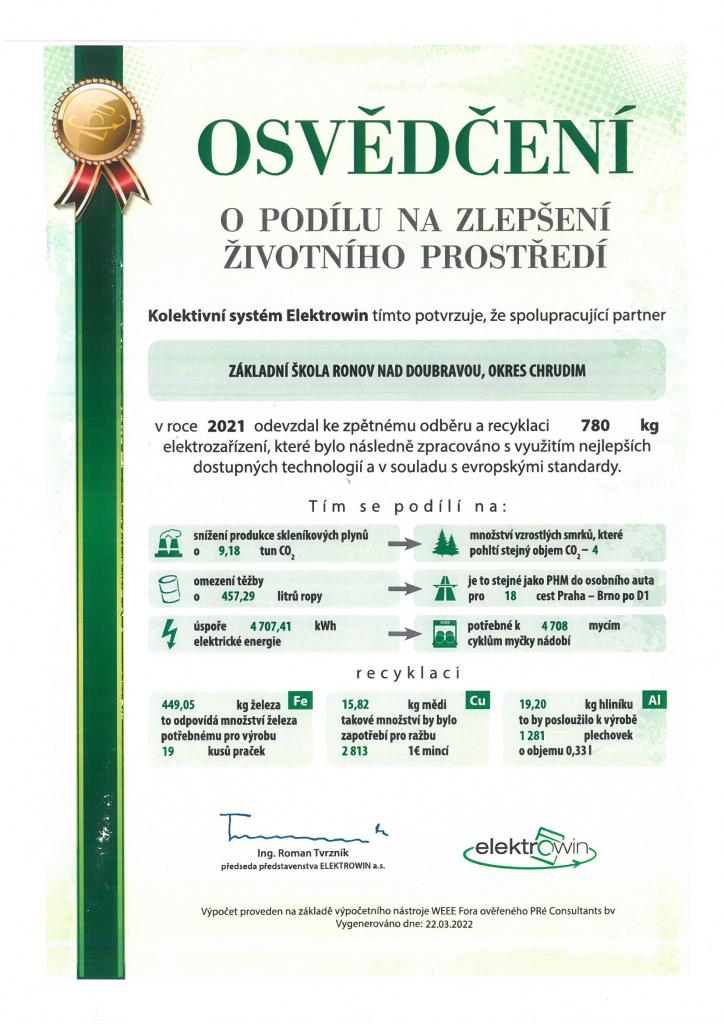 Naše základní škola odevzdala v roce 2021 v rámci projektu Recyklohraní ke zpětnému odběru a k recyklaci 780 kg elektrozařízení a díky tomu získala Osvědčení o podílu na zlepšení životního prostředí.