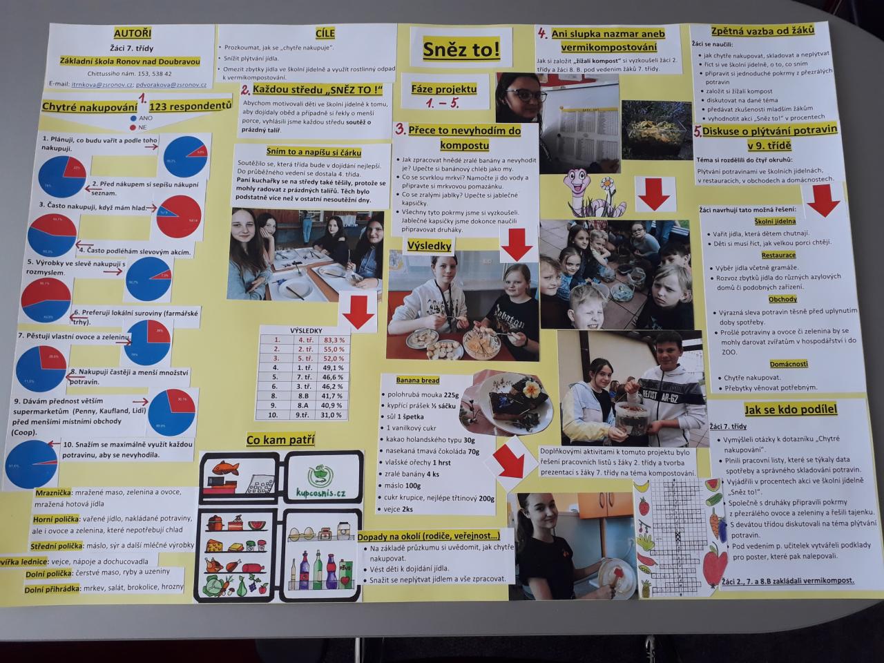 Jednak jsme byli odbornou porotou zařazeni mezi nejlepšími, ale také jsme získali cenu za inspirativnost.Náš projekt byl zaměřen na to, jak snížit plýtvání jídlem v domácnosti, ve školní jídelně, v obchodech i v restauracích a jak si založit vermikompost. Do projektu se zapojila celá škola. Žáci 7. třídy sestavili dotazník pro rodiče, který se týkal chytrého nakupování, řešili datum spotřeby a správné skladování potravin. Stěžejní částí celého projektu byla akce Sněz to aneb soutěž o prázdný talíř ve školní jídelně. Záměrem bylo říct si ve školní jídelně, o to, co sním. Menší děti se snažily více než děti druhostupňové. Žáci sedmé třídy předávali zkušenosti i mladším žákům, když z přezrálého ovoce společně připravili jednoduché pokrmy. Druháci a osmáci založili vermikompost a sedmáci vytvořili prezentace o kompostování. Deváťáci diskutovali na téma plýtvání potravin a společně navrhli řešení.