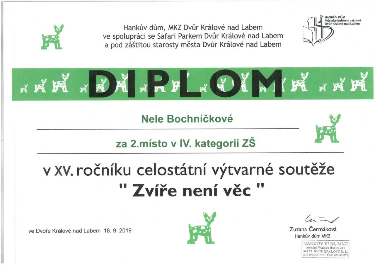 Nela Bochníčková, žákyně současné 9. tř., získala 2. místo v celostátní výtvarné soutěži „Zvíře není věc“v kategorii žáků 8. – 9. ročníku. Soutěž se konala pod záštitou města Dvůr Králové nad Labem ve spolupráci se Safari Parkem ve Dvoře Králové nad Labem a bylo do ní zasláno celkem 909 prací. Zaměřila se na vztah lidí ke zvířatům. Podtématem letošního ročníku bylo „Zvíře není hračka“.